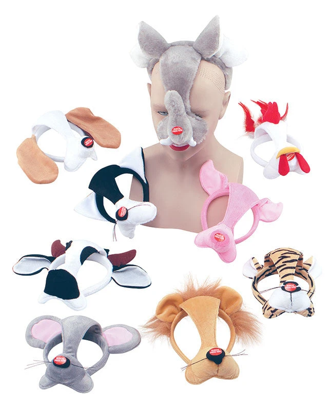 Half face animal masks on headband with sound effect – just press the nose. Choose from cat, chicken, cow, dog, elephant, lion, mouse, pig and tiger.