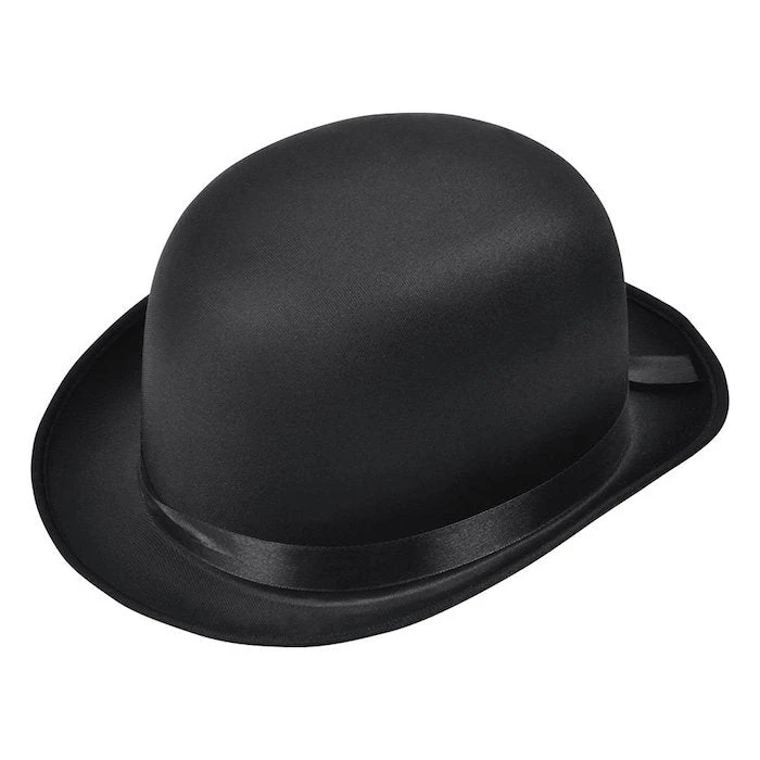 A felt bowler hat in rigid form covered in a black shiny satin.