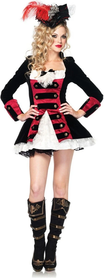 Our Leg Avenue Charming Pirate Captain fancy dress costume features a velvet layered waistcoat dress with lace accent.