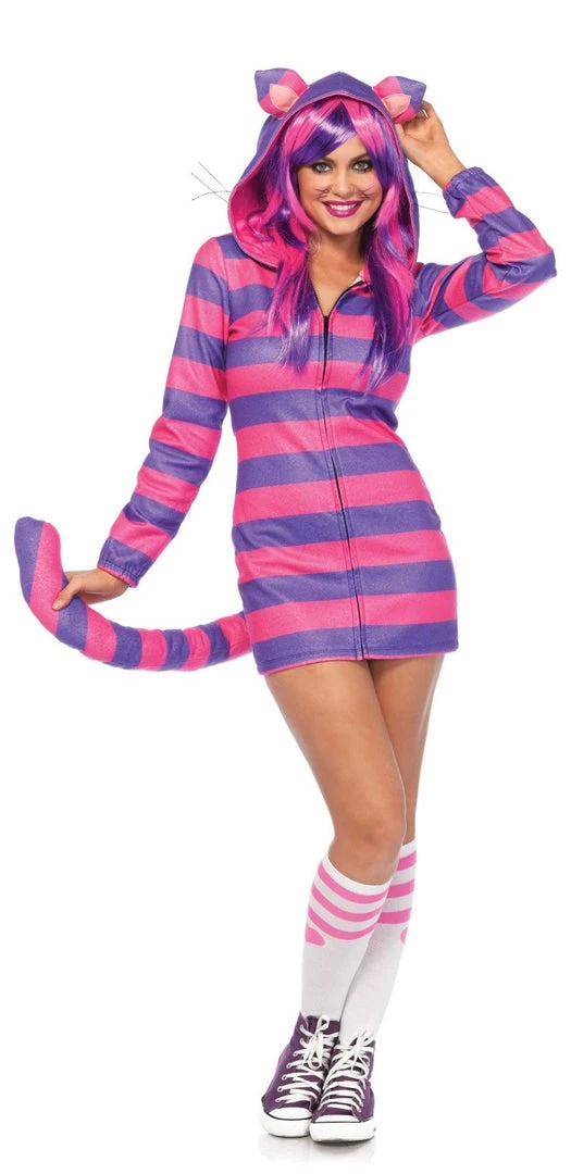 Our Leg Avenue Cozy Cheshire Cat features striped zipper front fleece dress with cat ear hood and long tail.