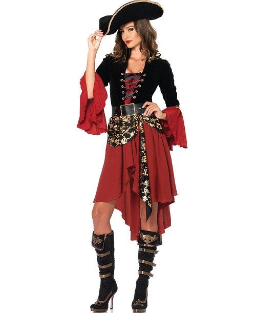 Go looking for the hidden treasure with our Leg Avenue 2Pc. Cruel Seas Captain. Includes High/Low Dress with velveteen lace up jacket detail, an attached skull sash and wide belt (hat is not included).