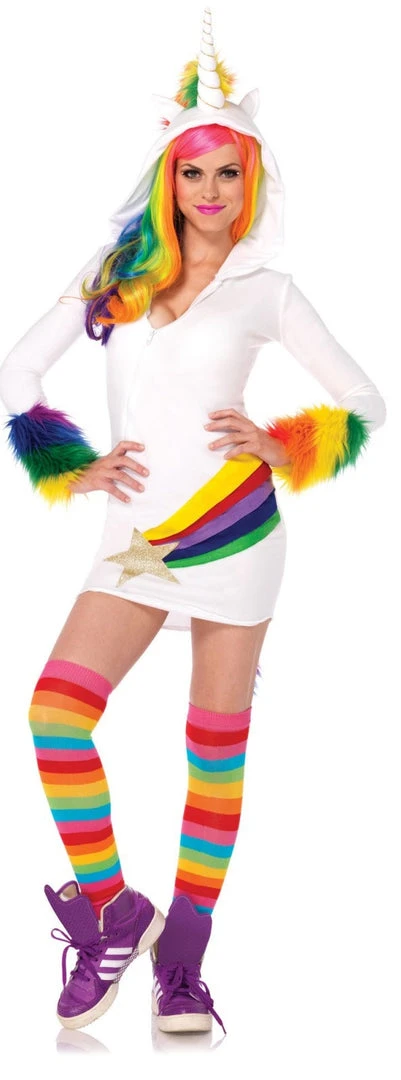 Our Leg Avenue Cozy Unicorn, features Zipper Front Shooting Star Fleece Dress with Furry Rainbow Cuffs, attached Authentic Unicorn Fur Tail and Mystical Horn Hood with Glorious Mane.