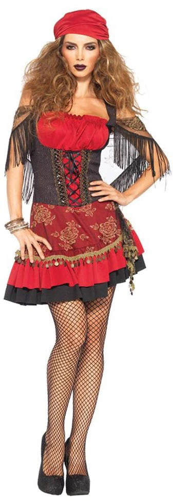 Our Leg Avenue 2PC. Mystic Vixen, includes peasant dress with coin trimmed glitter floral wrap skirt, attached fringed shoulder wrap, and matching head scarf.