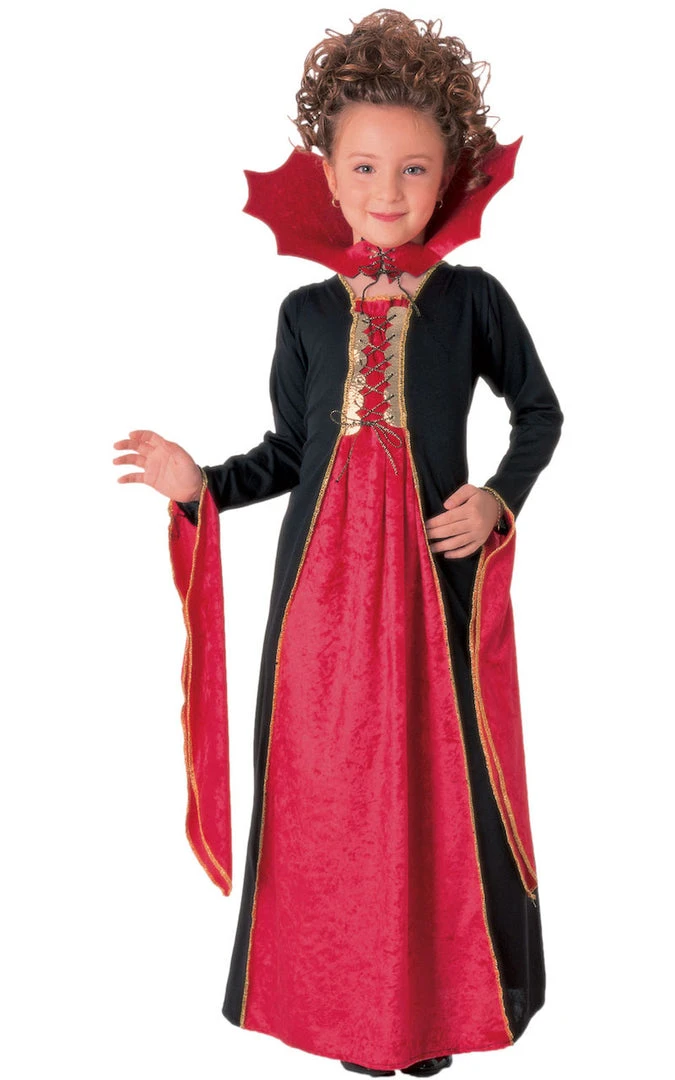 Turn your little girl into Vampiress this halloween in this gorgeous black and red velvet trimmed dress with drawstring and velvet collar.