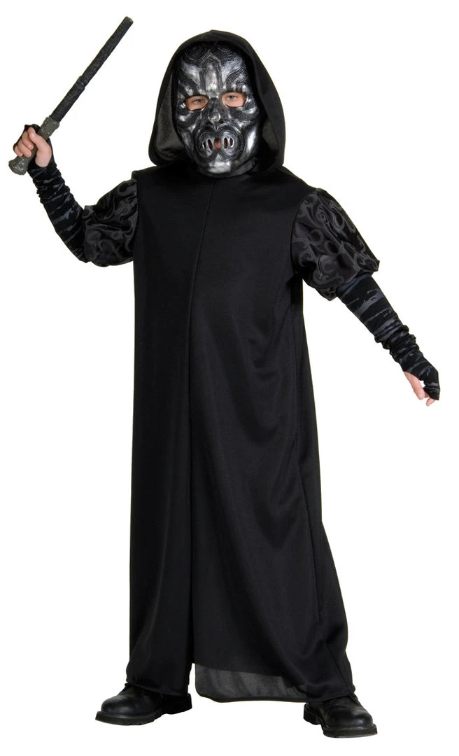 The costume includes a long black hooded robe with patterned puffed sleeves and a black and silver Death Mask, ideal for Book Days and Halloween.