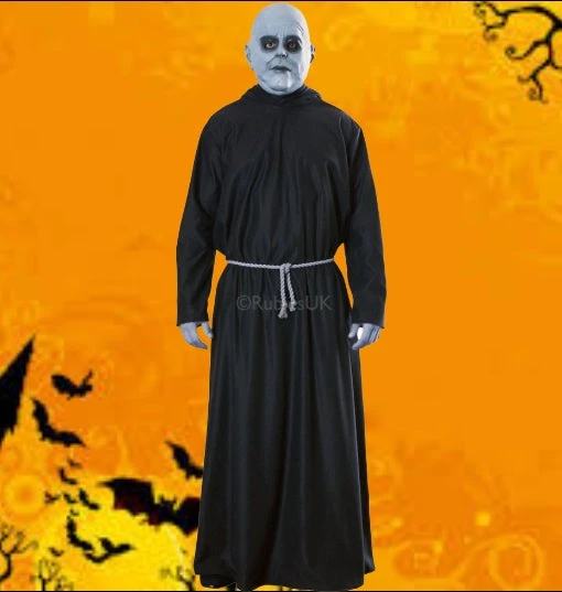 This licensed Addams Family costume includes a black hooded robe, belt cord and a half face character mask.