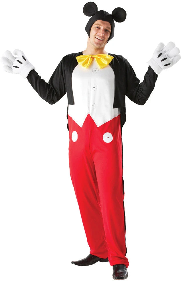 Turn yourself into the most famous mouse in the world with this fabulous costume which comprises of a red and white jumpsuit embellished with white buttons and attached black jacket, large padded cartoon glove hands, yellow bow tie and headpiece with iconic Mickey Mouse ears.