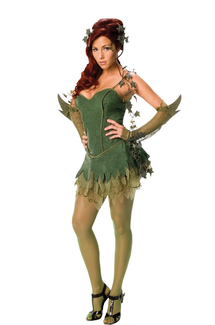 This official licensed Poison Ivy costume includes a short green dress with a jagged hemline, a pair of long green fingerless glovelets, an ivy headpiece and an ivy leaf boa.
