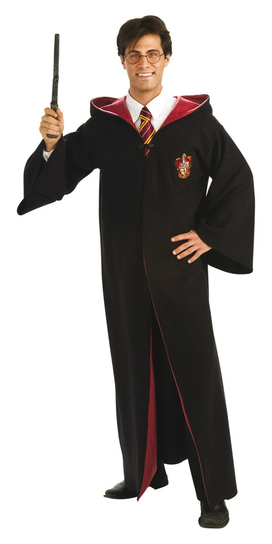 The costume includes a long black robe with red lining, clasp fronted and Gryffindor badge to front.