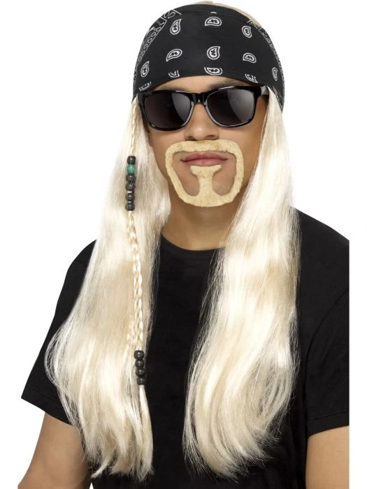 This hard rocker kit in blonde includes a wig, bandanna, beard and glasses.
