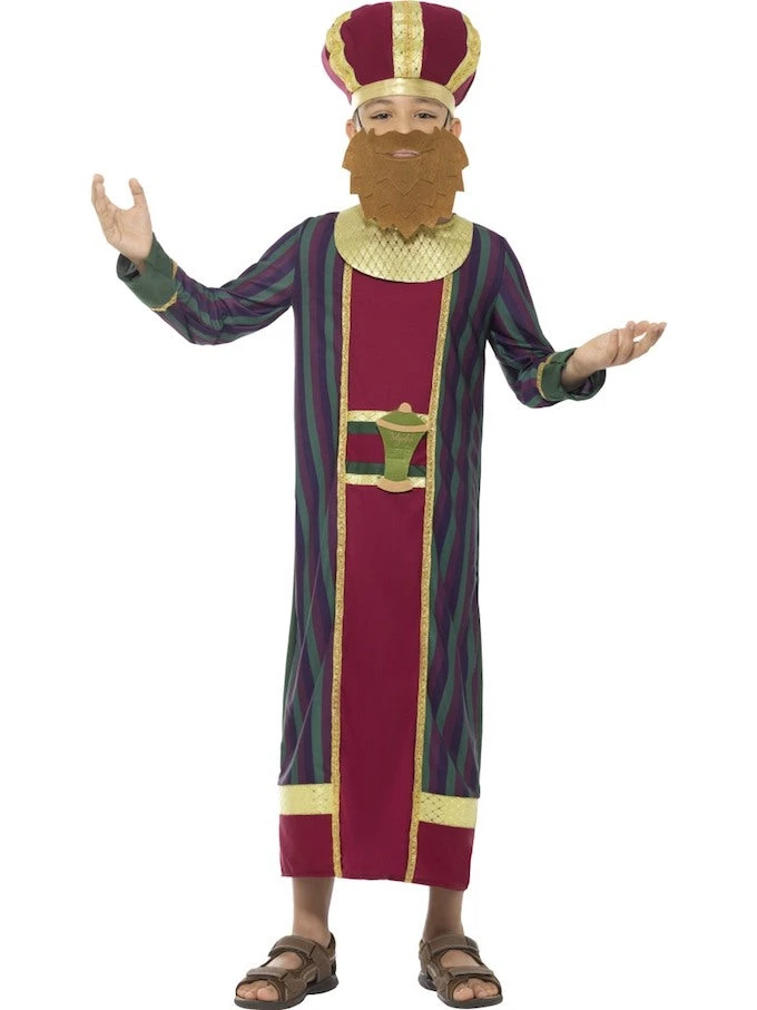 Our Childs King Balthazar includes full length robe with pinstriped sides and a red panelled centre.