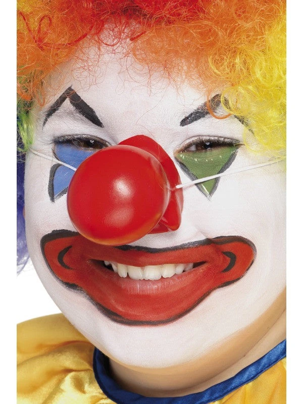 This squeaking clown nose is made of plastic and is on an elastic.Â