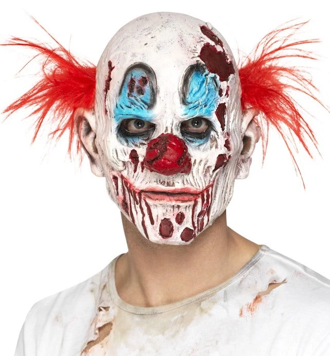 Our Zombie Clown foam latex mask with hair is perfect for halloween, complete with exposed flesh and dripping blood.