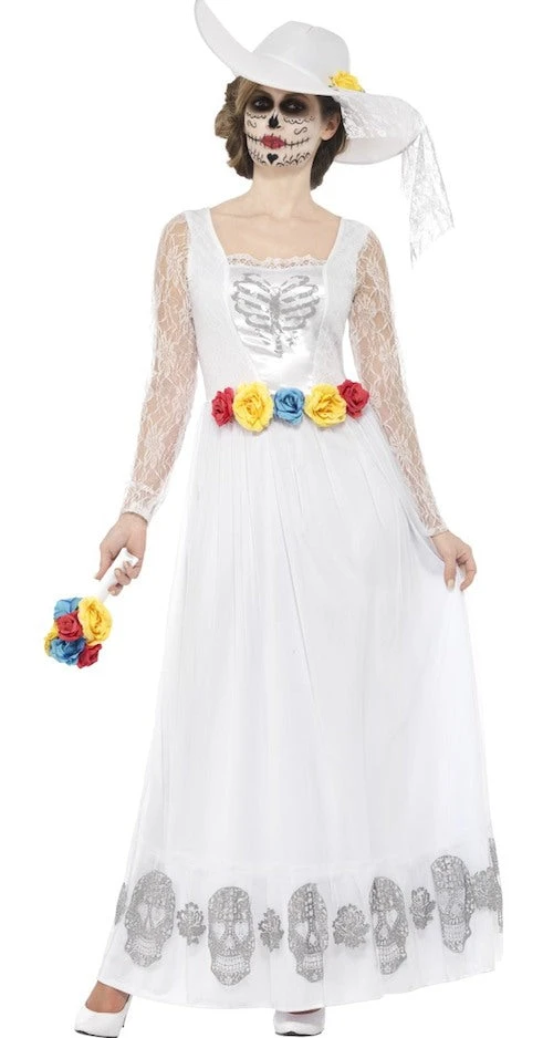 Our Day of the Dead Skeleton Bride costume is the perfect Halloween costume, which includes Full Length White Wedding Dress with Skull Print on the Hem and Multicoloured Roses around the Waist.