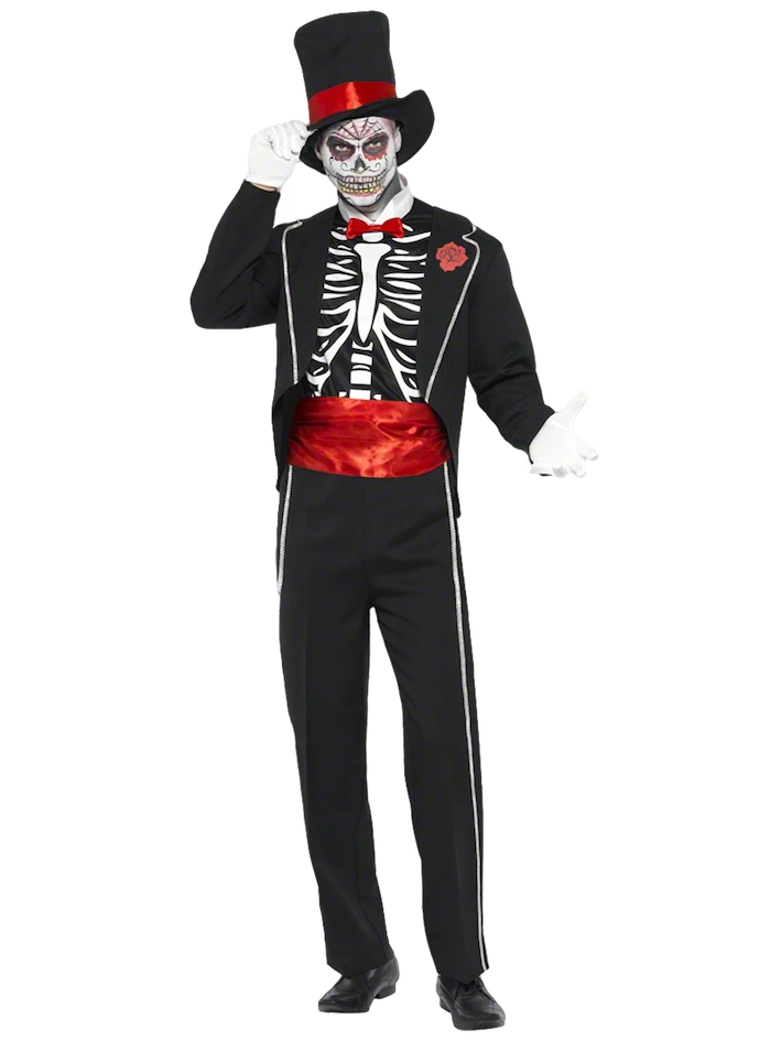 Our Day of the Dead costume goes back to its traditional look, complete with mock printed skeleton shirt front, black tailcoat jacket, matching hat and white gloves.