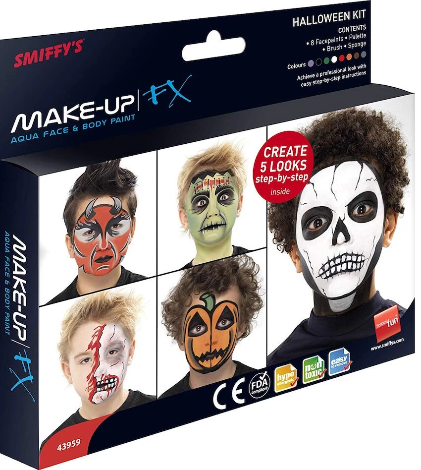 Our Halloween palette includes 8Â face paints, sponge and brush.