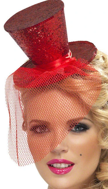 Our Mini red Top Hat on a Headband with Detachable Netting will add the finishing touch to many Burlesque Costume.