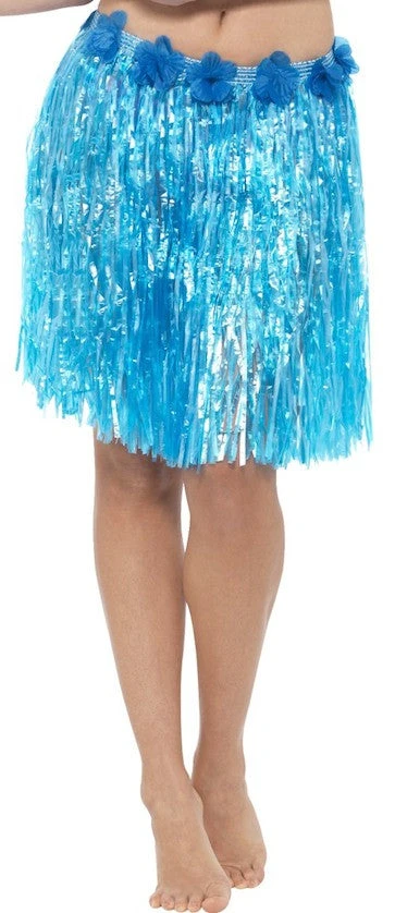 Our Neon Blue Hawaiian Hula Skirt, with flowers has a velcro fastening and adjustable waist band.