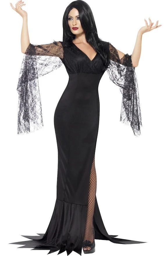 Our Immortal Soul costume is a perfect Halloween-Morticia style costume, which comes with a long black floor-length dress with attached lace sleeves.