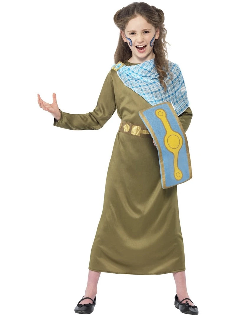 Our Boudica costume includes a khaki green dress with attached brown belt, plus a one shouldered shawl and a soft fabric shield.