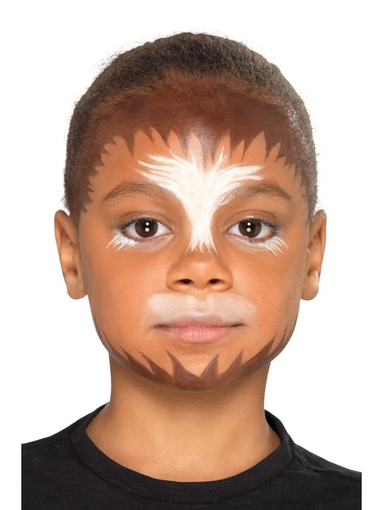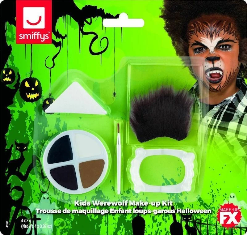 Our Children’s, Halloween Werewolf Makeup Kit includes, 4 Coloured Cream Face Paints, Fangs, Fur Stickers, Sponge and Brush.