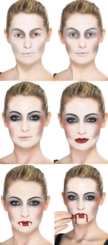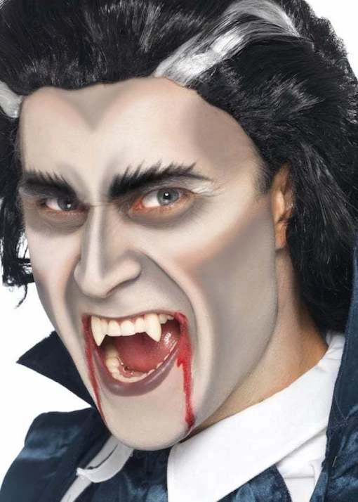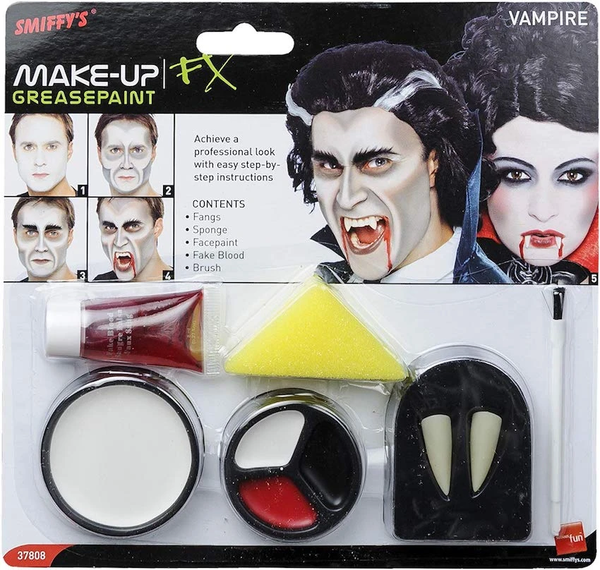 Our Vampire Make Up Kit includes Fangs, Sponge, Cream Face Paint and blood, everything any self respecting Vampire needs this halloween.
