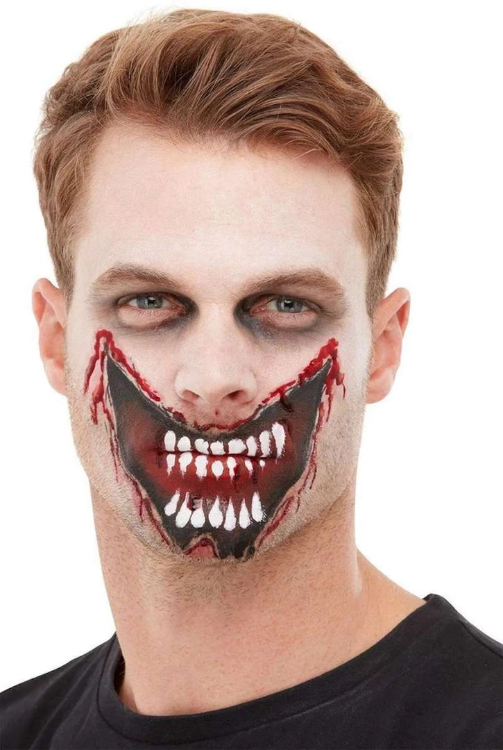 Our Slashed Mouth Make-Up Kit includes Cream Face Paint, Blood, Transfer, Sponge & Applicator
