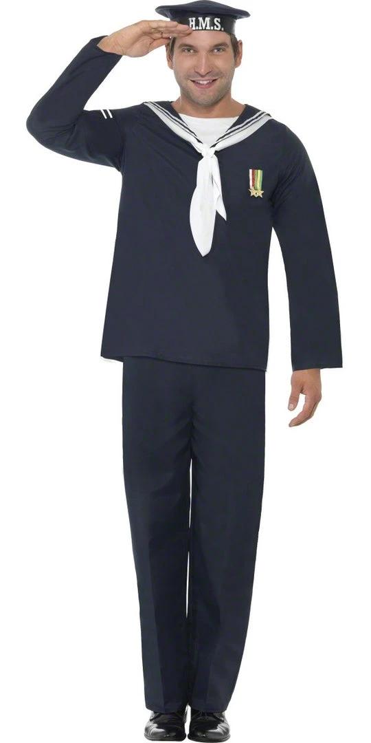 Man your stations with our 1940’s Naval Seaman costume, which includes a Blue Top with Tie and Medals, Trousers and Hat.