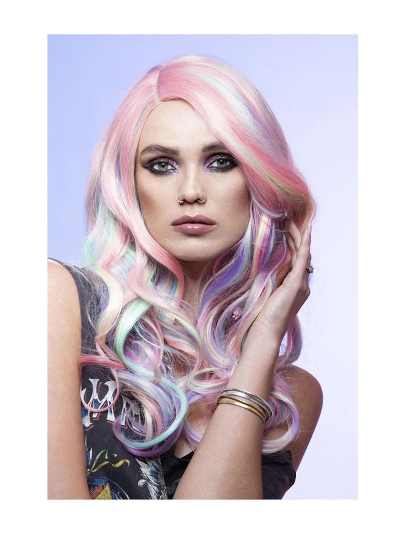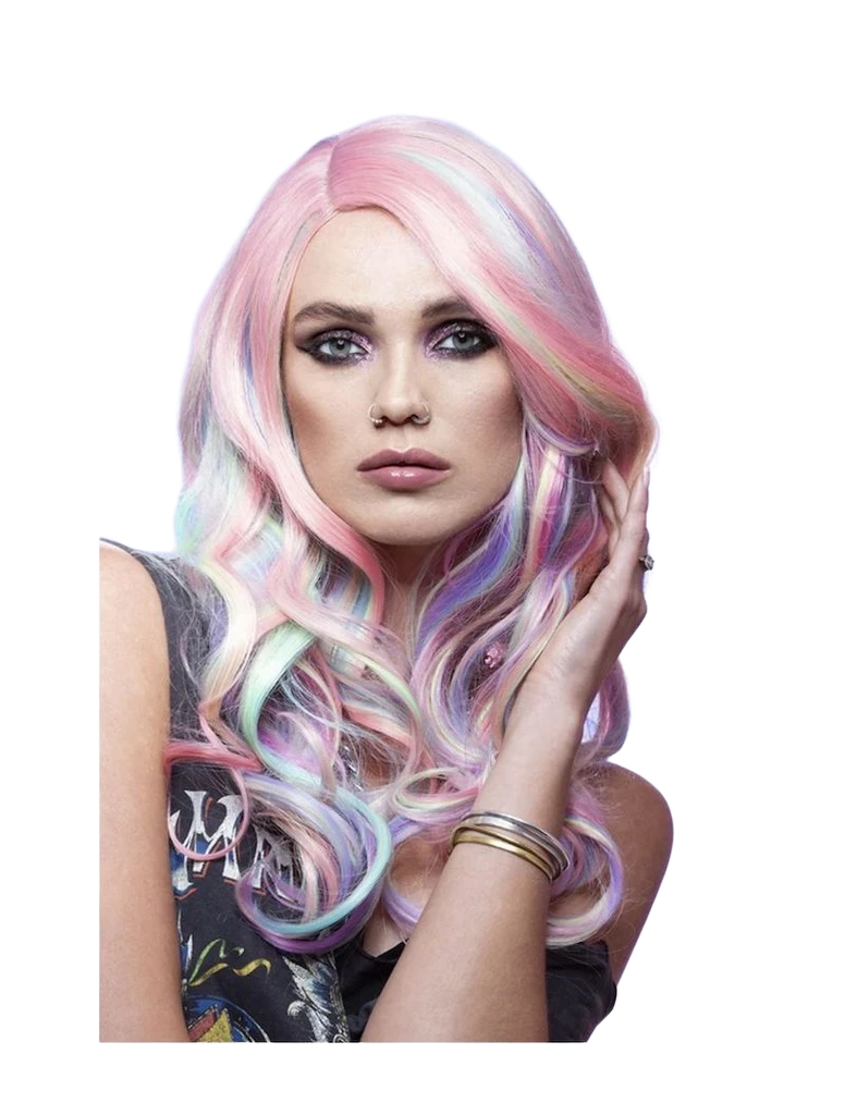 Our Manic Panic, Unicorn Dream Wig, with soft Curls and a swooping side parting is also known as “Queen Bitch”