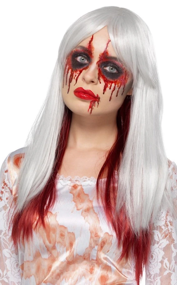 Our Deluxe, Ombre, Blood Drip Two-Tone Wig is perfect to complete any Gothic Bride or Vixen halloween costume.