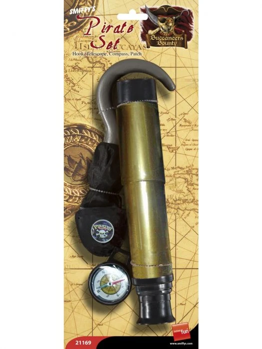 Pirate set includes: hook, Telescope, Compass and patch.Â