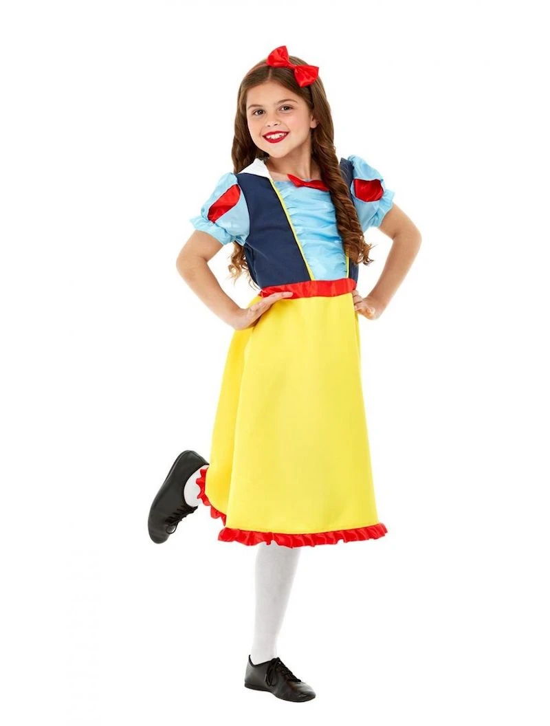 Our Snow Princess costume includes knee length dress with a blue top, puff ball sleeves and a silky red bow, and yellow skirt, plus red headband with an attached bow.