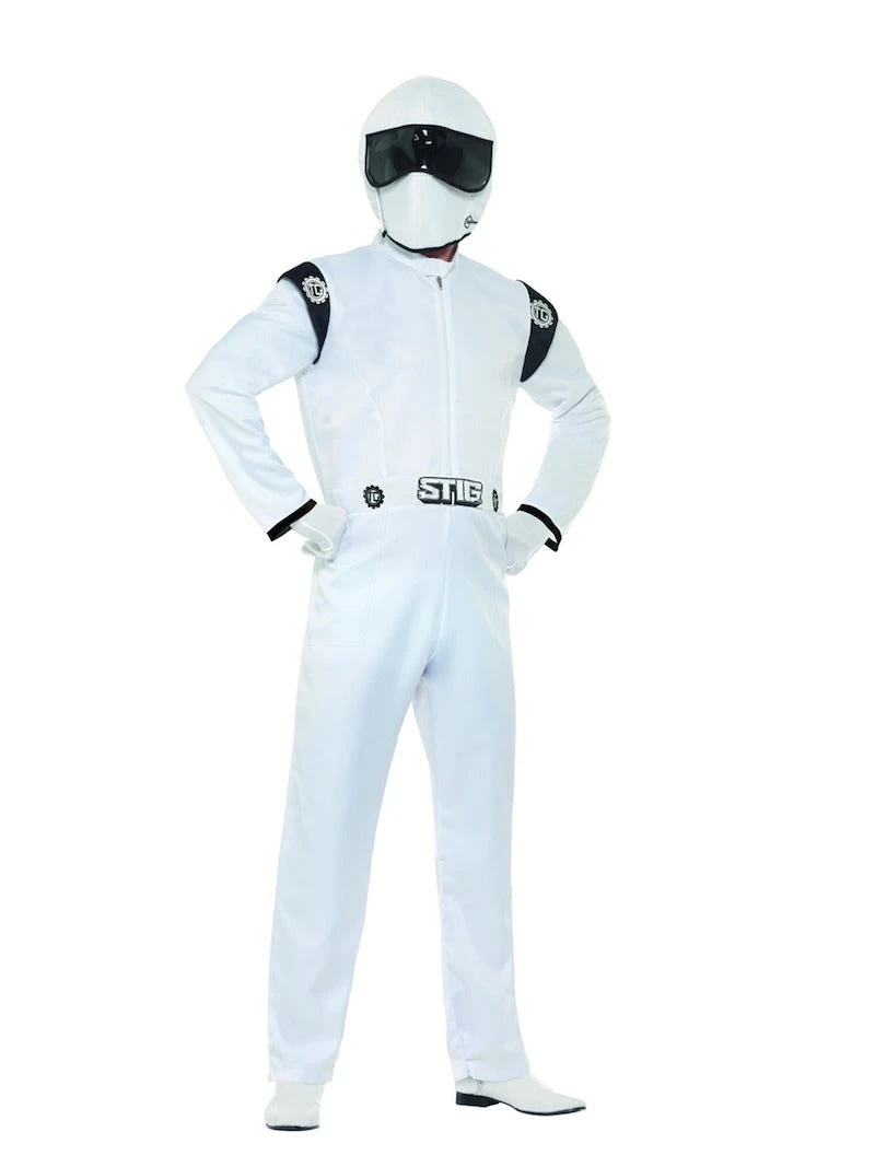 Our Stig Costume from the BBC series Top Gear includes an “all in one” zipped up jumpsuit with a Velcro fastening at the top.