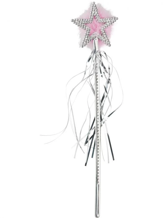 Plastic star wand with fluffy pink pom pom and dazzling tinsel.