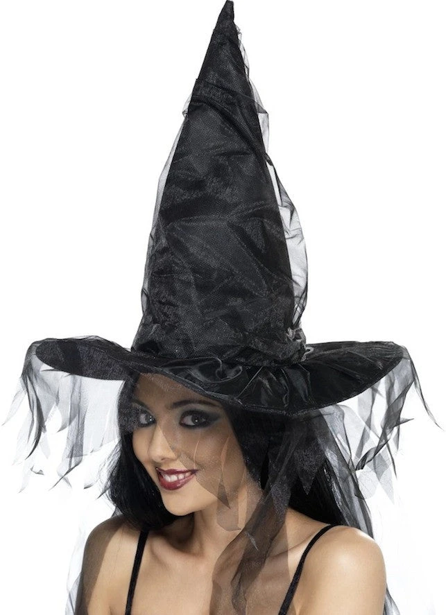 Our Black Witches Hat with Netting will add the finishing touch to any witch costume.