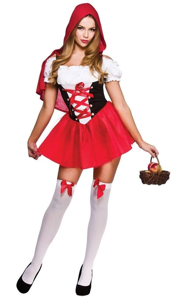 Our Little Red Riding Hood includes a dress with corset style top and attached hooded cape.