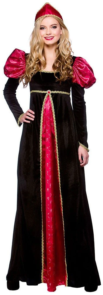 Our Medieval Queen includes a long dress with gold trim and a headpiece.