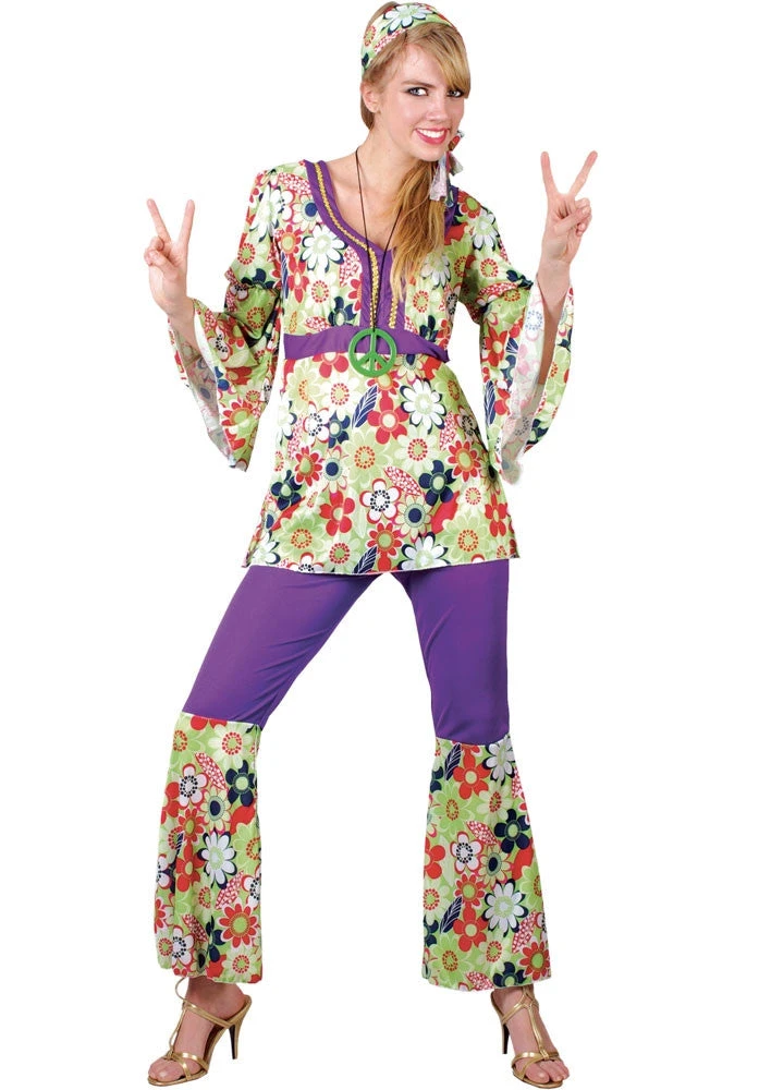This colourful Hippy Chick costume includes a flower patterned floaty top, purple trousers with flowery bottoms, headband & medallion.