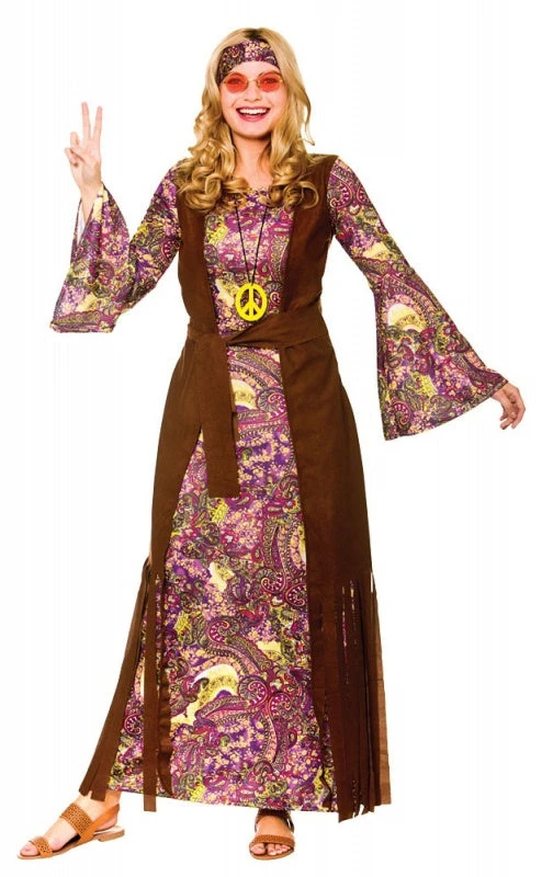 Our Summer of Love costume is the perfect outfit for any Hippy themed event! Costume includes dress with attached waistcoat, belt, headband & medallion