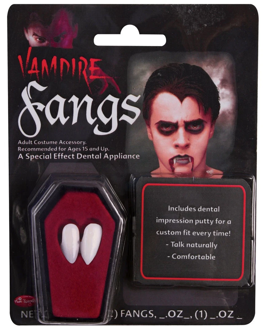 Our Vampire Fangs from Funworld, include a thermoplastic putty adhesive to help mould fangs to the shape of your teeth.
